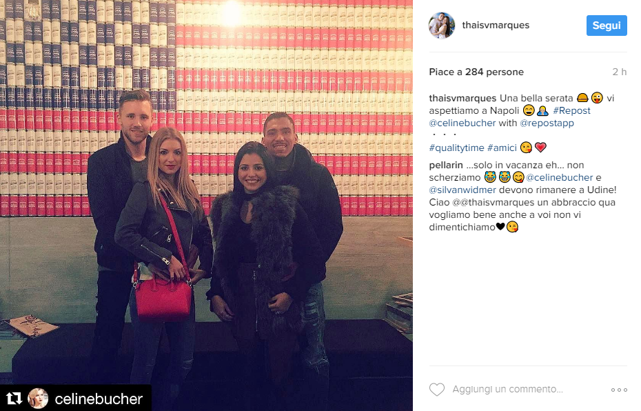 Allan e Widmer, compagni di squadra ai tempi dell’Udinese, si sono concessi qualche giorno di relax. Il centrocampista azzurro, insieme alla moglie, ha ospitato l’esterno dell’Udinese a Napoli.