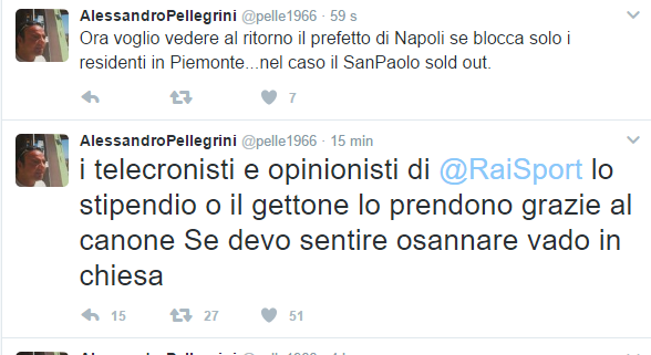 Alessandro Pellegrini, agente di Maurizio Sarri, ha commentato polemicamente Juventus-Napoli con due tweet infuocati. Eccoli di seguito: