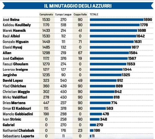 Analizzando il minutaggio dello scorso anno, la situazione che si palesava era quasi definibile come “preistorica”, in ambito di rotazione. Maurizio Sarri concentrava grandissima parte del minutaggio in soli undici uomini, con una differenza in minuti giocati fra undicesimo (Insigne, 2622 minuti) e dodicesimo (Mertens, 1087 minuti) immensa.