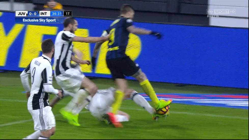 Non è vittimismo, sia chiaro: lo si dice per spegnere sul nascere ulteriori polemiche. E per dimostrarlo non serve andare indietro di vent’anni ma spostare la lancetta di qualche settimana: Juventus-Inter dello scorso cinque febbraio. Più di un contatto dubbio in area bianconera, ma quello che fa storcere il naso è un intervento di Bonucci su Icardi: il bianconero prende, lo si vede dall’immagine a destra, la palla ma, nell’impatto, travolge il capitano nerazzurro. Nessun calcio di rigore perché è nelle leggi della natura la caduta di un corpo se urtato da un altro o da più.