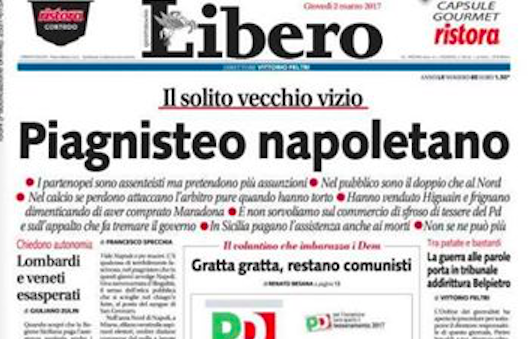 “I partenopei sono assenteisti ma pretendono più assunzioni; Nel calcio se perdono attaccano l’arbitro pure quando hanno torto; Hanno venduto Higuain e frignano dimenticando di aver comprato Maradona”: questo il sommario che campeggia sotto il titolo della prima pagina, a sua volta tutto un programma (“Piagnisteo napoletano”).