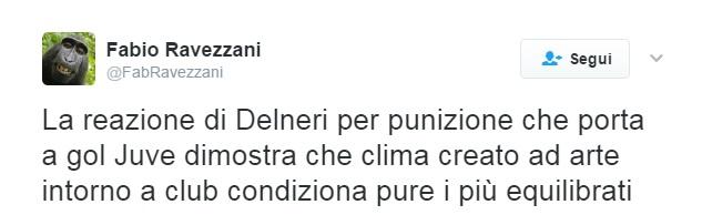 Delneri si è lamentato a fine partita per la direzione arbitrale. E la cosa ha portato il giornalista di Telelombardia, Fabio Ravezzani, a scrivere un tweet alquanto polemico: “La reazione di Delneri per punizione che porta a gol Juve dimostra che clima creato ad arte intorno a club condiziona pure i più equilibrati“. Che si riferisca alle lamentele del Napoli?