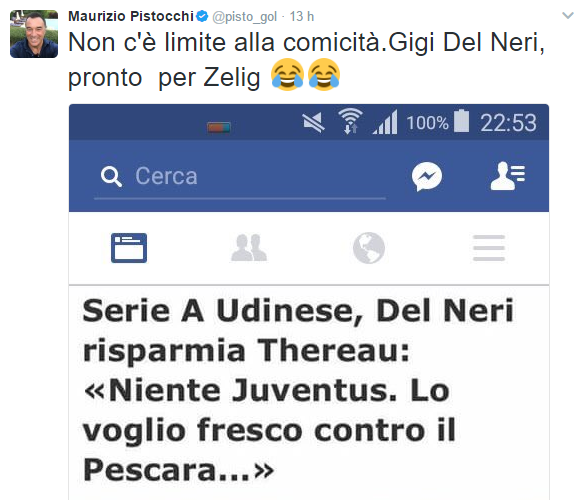 Maurizio Pistocchi ha commentato con sarcasmo la decisione del tecnico: “Non c’è limite alla comicità, Delneri è pronto per Zelig” ha scritto sul proprio profilo Twitter.