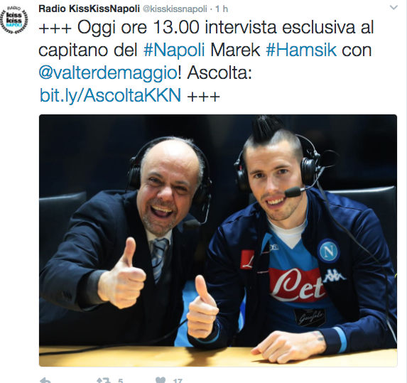 Non solo però: perché alle 13, ai microfoni di Radio Kiss Kiss Napoli, interverrà il capitano azzurro, Marek Hamsik, come comunicato proprio dalla radio ufficiale del Napoli attraverso Twitter.