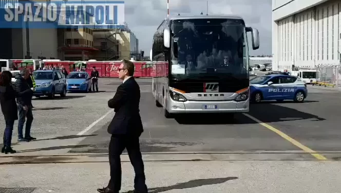 Il Real Madrid è atterrato a Napoli alle 12.42. Il bus dei galacticos ha lasciato l’aeroporto di Capodichino dall’uscita della base militare Nato, dove erano assiepati un centinaio di tifosi che hanno accolto con entusiasmo la squadra di Zidane: tra i più acclamati, ovviamente, Cristiano Ronaldo.