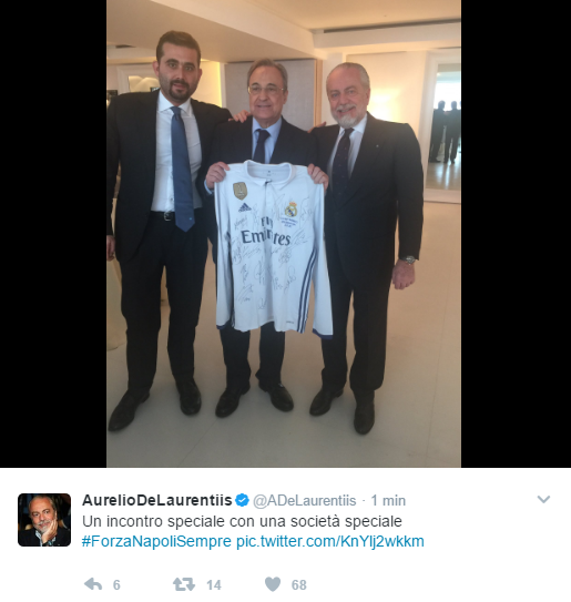 A questo proposito Aurelio De Laurentiis, sul proprio profilo Twitter, ha postato una foto in compagnia del figlio Edoardo e di Florentino Perez, con in mano una camiseta blanca autografata.