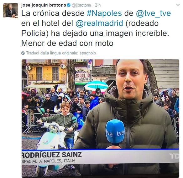 Un tweet che esterna tutta l’incredulità di un collega spagnolo, José Joaquin Brotons di Eurosport. Una foto che immortala all’esterno di Palazzo Caracciolo, alle spalle di un collega iberico, un ragazzino alla guida di un motorino senza casco.