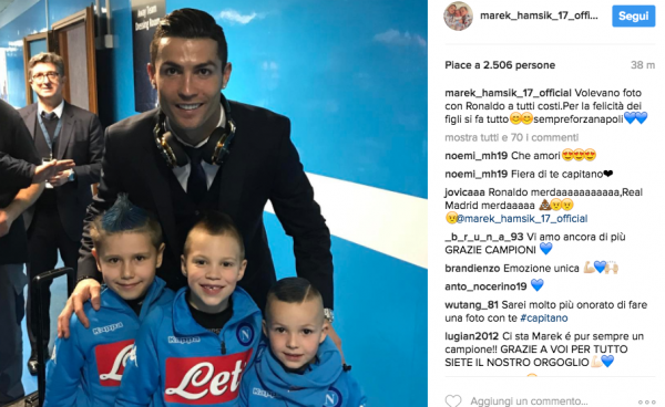 “Volevano foto con Ronaldo a tutti i costi. Per la felicità dei figli si fa tutto. Sempre Forza Napoli”: così il capitano azzurro, Marek Hamsik, attraverso il suo profilo Instagram.