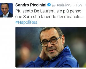 Chiarissimo il riferimento alle dichiarazioni rilasciate da De Laurentiis dopo la partita di ieri contro il Real Madrid. Evidentemente, Piccinini non ha gradito né i commenti del presidente contro alcuni giornali e giornalisti, né il suo cambio di valutazione del lavoro di Sarri rispetto a quanto rilasciato, sempre ai microfoni di Premium, nel post-gara dell’andata.
