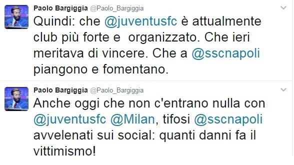 Ancora una volta Paolo Bargiggia prende posizione su Twitter nei confronti del Napoli e, soprattutto, dei suoi tifosi. Nel commentare l’anticipo del venerdì tra Juventus e Milan, il giornalista di Mediaset non ha risparmiato una menzione per gli azzurri: