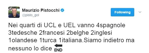 Questo divario ha scatenato molti commenti degli addetti ai lavori. L’ultimo ad aver sottolineato quanto sia complicata la situazione del calcio italiano è stato il giornalista Maurizio Pistocchi che su Twitter ha scritto: “Nei quarti di UCL e UEL vanno 4spagnole 3tedesche 2francesi 2belghe 2inglesi 1olandese 1turca 1italiana.Siamo indietro ma nessuno lo dice 🔚“.