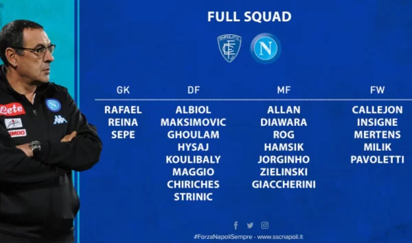 Il tecnico del Napoli, Maurizio Sarri, ha diramato la lista dei convocati per il match di domani contro l'Empoli, che si giocherà allo stadio Castellani alle 12.30.