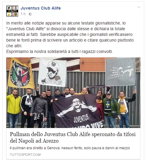 A smentire la notizia che li definiva protagonisti, sono intervenuti i diretti interessati, tramite la loro pagina Facebook ufficiale. Un post dal contenuto molto preciso: “In merito alle notizie apparse su alcune testate giornalistiche, lo “Juventus Club Alife” si dissocia dalle stesse e dichiara la totale estraneità ai fatti. Sarebbe auspicabile che i giornalisti verificassero bene le fonti prima di scrivere un articolo e citare qualcuno piuttosto che altri. Esprimiamo la nostra solidarietà a tutti i ragazzi coinvolti”.