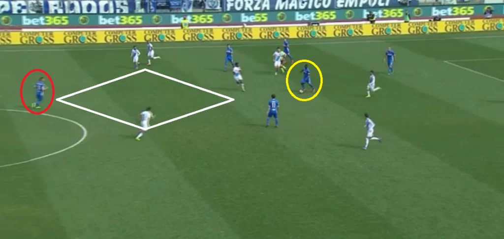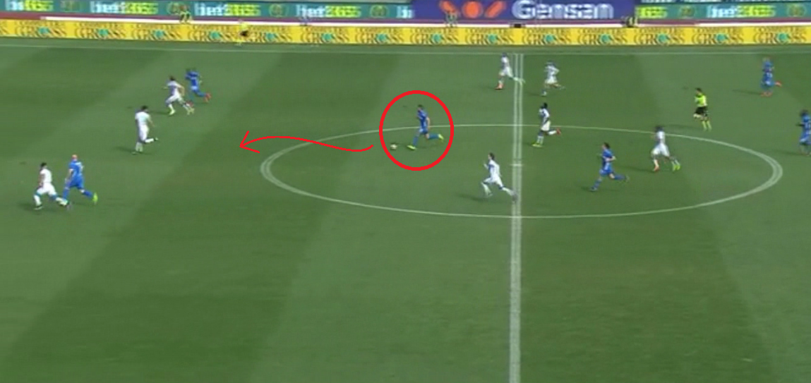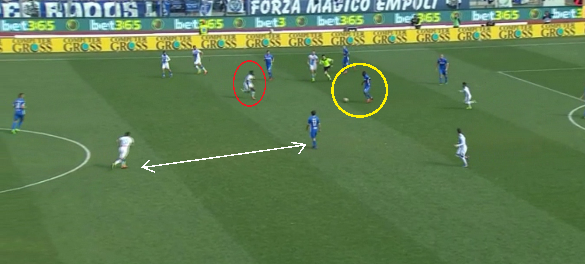 El Kaddouri (cerchio rosso) guida palla (freccia rossa) indisturbato, con la possibilità di puntare la retroguardia azzurra e di creare un 3contro3 centrale