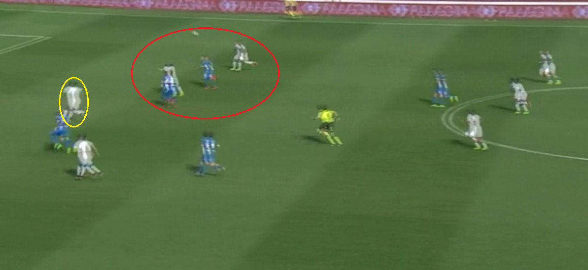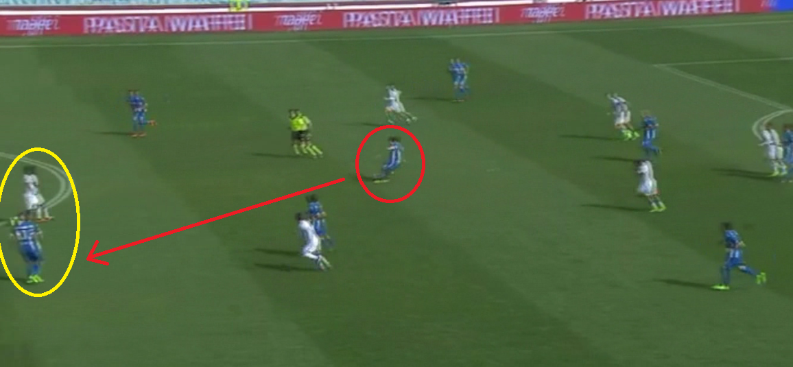 Detto ciò, il problema non resta la palla scoperta, ma la lettura della linea di difesa azzurra – e non solo – su tale giocata: Albiol (cerchio giallo) offre la giusta copertura. Quelli bravi direbbero “scappa bene”. Chiriches (cerchio rosso) si lascia, invece, scavalcare dal pallone. Centrocampo azzurro pigro nel ripiegare in aiuto dei quattro difensori, considerando che in questa determinata situazione, l’Empoli porta tre uomini in linea con la difesa azzurra, più due a rimorchio da centrocampo
