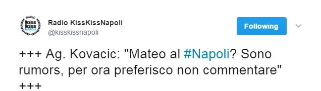 Proprio in questa ottica nelle scorse ore si era sparsa la notizia di un possibile interessamento dei partenopei per Mateo Kovacic, forte centrocampista croato in forza al Real Madrid. Per saperne di più sulla possibile trattativa, la redazione di Radio Kiss Kiss – come mostra un post su Twitter – ha contattato il suo agente, Nikky Vuksan, che però ha preferito non sbilanciarsi più di tanto: “Mateo al Napoli? Sono rumors, per ora preferisco non commentare“, queste le sue parole.