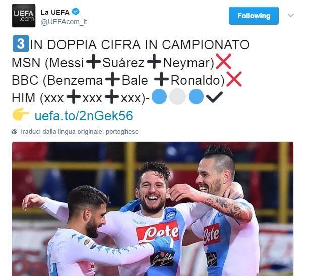 Simpatico tweet quello postato dall’Uefa che ha celebrato Hamsik, Insigne e Mertens, coniando il trio HIM. Il tridente azzurro, infatti, ha raggiunto la doppia cifra in campionato, proprio come altri due trii: la MSN del Barcellona, composto da Messi, Suarez e Neymar, e la BBC del Real Madrid, formato da Benzema, Bale e Cristiano Ronaldo.