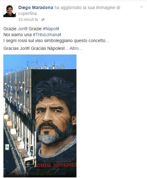 Maradona ha così voluto ringraziare l’artista con un bellissimo messaggio postato sulla sua pagina Facebook: “Grazie Jorit! Grazie #Napoli! Noi siamo una #TribùUmana! I segni rossi sul viso simboleggiano questo concetto…“.