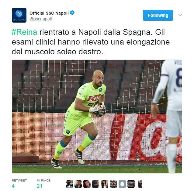 Tramite il profilo Twitter la SSC Napoli ha voluto pubblicare un aggiornamento sulla situazione dell’estremo difensore partenopeo: “#Reina rientrato a Napoli dalla Spagna. Gli esami clinici hanno rilevato una elongazione del muscolo soleo destro“.