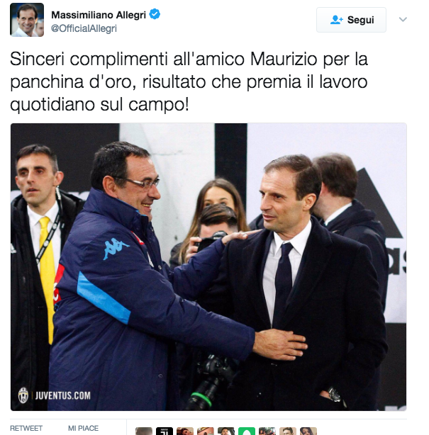 “Sinceri complimenti all’amico Maurizio per la panchina d’oro, risultato che premia il lavoro quotidiano sul campo!”: questo il testo del messaggio che Massimiliano Allegri ha pubblicato attraverso il suo profilo Twitter.