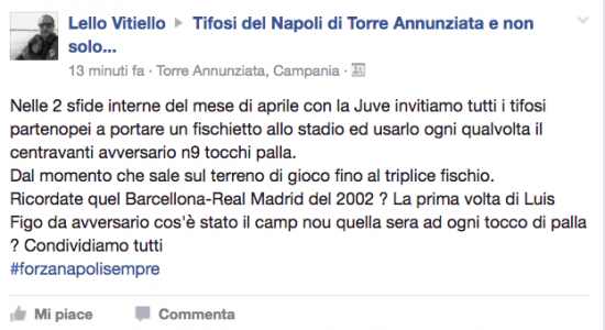 E le iniziative su come accogliere l’attaccante argentino al San Paolo si moltiplicano sul web: l’ultima viene dal gruppo “Tifosi del Napoli di Torre Annunziata e non solo”: un fischietto per ogni sostenitore azzurro che andrà a Fuorigrotta, in modo da fischiare sonoramente Higuain ogni qual volta tocchi palla.