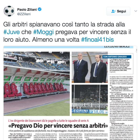 Gli ha risposto, attraverso Twitter, il giornalista Paolo Ziliani: “Gli arbitri spianavano così tanto la strada alla Juve che Moggi pregava per vincere senza il loro aiuto. Almeno una volta fino al 41 bis”.