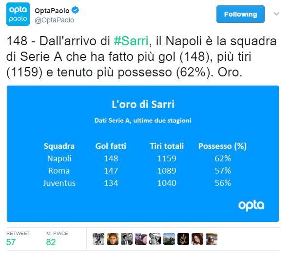 Ci sono diversi numeri che testimoniano l’ottimo lavoro di Maurizio Sarri. Oltre al posizionamento in campionato e al passaggio del girone in Champions League. Sicuramente una squadra offensiva e spettacolare è tra i meriti del toscano. Non è un caso che proprio OptaPaolo abbia voluto sottolineare questo aspetto. Il Napoli infatti risulta essere la squadra della massima serie ad aver effettuato più goal, tenuto più il possesso e tirato più in porta da quando è iniziata la gestione Sarri. I partenopei hanno segnato ben 148 reti contro le 147 della Roma e le 134 della Juventus. Sono 1159 i tiri degli azzurri, contro i 1089 dei capitolini e i 1040 dei torinesi. Infine impressionante il possesso palla: 62%, ad indicare il dominio del gioco in campo.