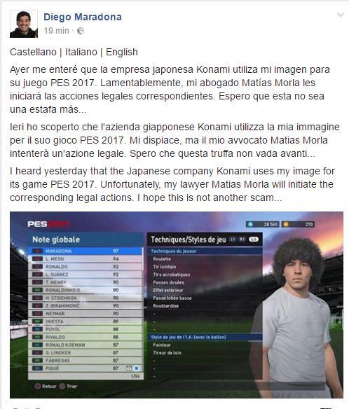 Secondo Maradona la Konami avrebbe utilizzato impropriamente la sua immagine all’interno del famoso videogioco PES 2017. Come rivela tramite il suo profilo, l’argentino ha dato mandato al suo avvocato Matias Morla per fermare quella che definisce “una truffa”.