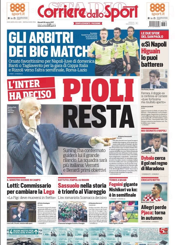 Il Corriere dello Sport apre in prima pagina con la scelta dell’Inter: “Pioli resta“. Suning conferma, sarà l’allenatore italiano a guidare il rilancio dei nerazzurri. In taglio alto si parla di arbitri, con Orsato, Rizzoli e Banti a distribuirsi le gare importanti delle prossime settimane. In spalla il doppio ex Ciro Ferrara: “Sì Napoli, Higuain lo puoi battere“, nonostante la Juventus sia la grande favorita il risultato rimane aperto, mentre sui bianconeri troviamo: “Dybala cerca il gol nel regno di Maradona“. Sulla versione Campania spazio anche ai rinnovi in casa Napoli: “Mertens, gol e contratto da top player“.
