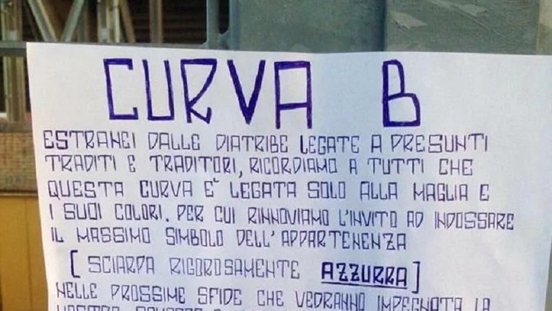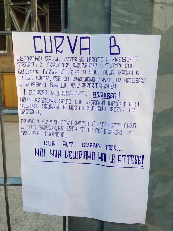 “Estranei da presunte diatribe legate a presunti traditi e traditori, ricordiamo a tutti che questa Curva è legata solo alla maglia e i suoi colori, per cui rinnoviamo l’invito ad indossare il massimo simbolo dell’appartenenza, sciarpa rigorosamente azzurra, nelle prossime sfide che vedranno impegnata la nostra squadra e indossarla con fierezza ed orgoglio. Gonfia il petto partenopeo, è l’appartenenza il tuo blasone ed essa ti fa più grande di qualsiasi campione. Cori alti, sciarpe tese: non deludiamo le attese!”. Questo il comunicato della Curva B sulla vicenda Higuain e sulla tanto vociferata accoglienza all’argentino.