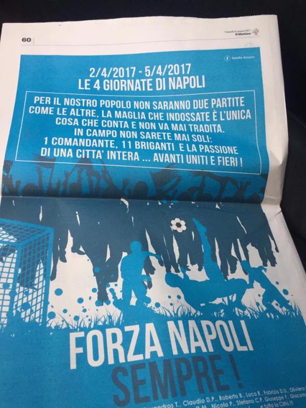 Infatti, come si può vedere da Il Mattino, un gruppo di tifosi azzurri ha acquistato una pagina dello storico quotidiano mandando un messaggio ai calciatori del Napoli in vista del doppio impegno con la Juventus.