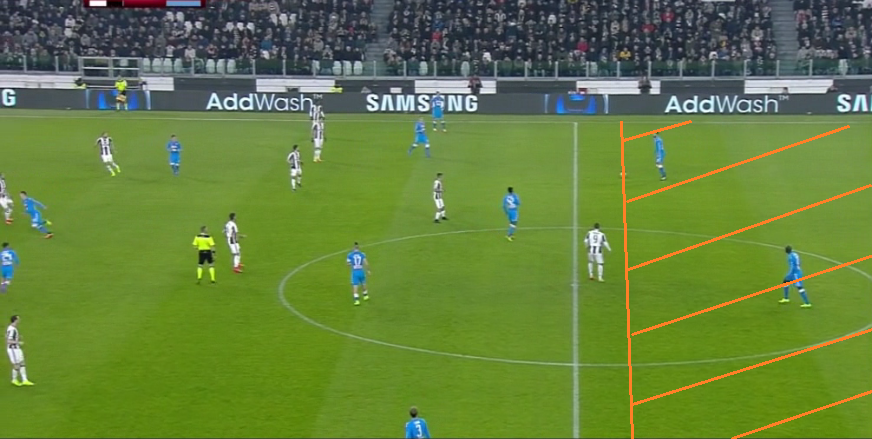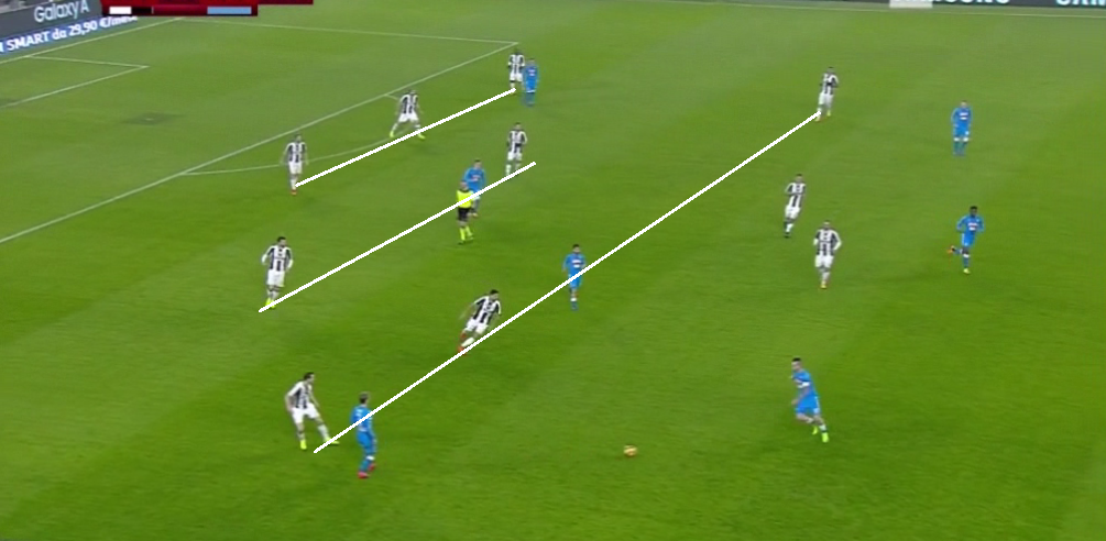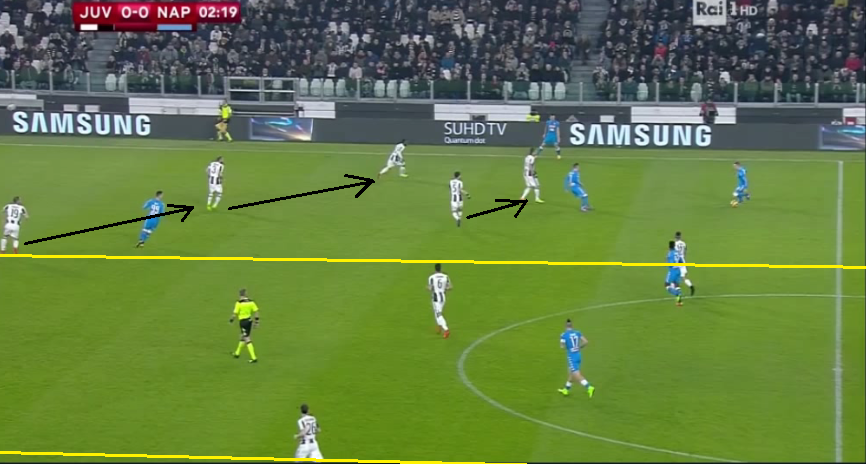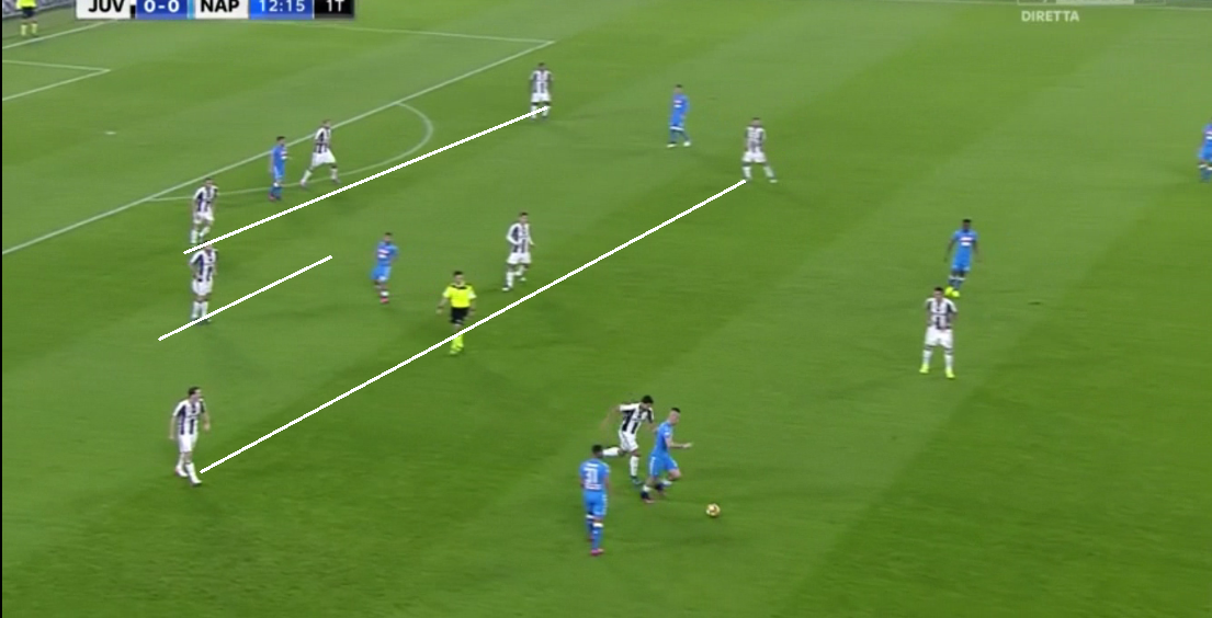 Superata la prima fase di possesso, la Juventus concede campo al Napoli cercando costantemente di annullare ogni possibile passaggio filtrante, lasciando invece l’ampiezza: