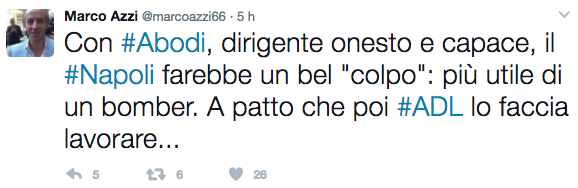 Il giornalista di Repubblica, Marco Azzi, ha scritto sul suo profilo Twitter: “Con Abodi, dirigente onesto e capace, il Napoli farebbe un bel “colpo”: più utile di un bomber. A patto che poi De Laurentiis lo faccia lavorare…”.