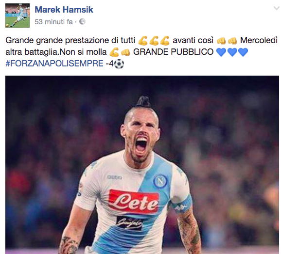 Attraverso la sua pagina Facebook, Marek Hamsik ha lasciato un messaggio importante, che denota la voglia, sua e della squadra, di lottare ancora per battere la Juve mercoledì e arrivare in finale di Coppa Italia.