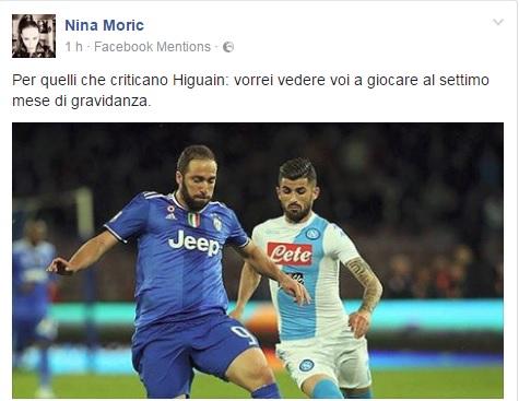 Al termine del big match di Serie A la modella ha ben pensato di commentare su Facebook la prestazione, non certo memorabile, di Gonzalo Higuain: “Per quelli che criticano Higuain: vorrei vedere voi a giocare al settimo mese di gravidanza“.