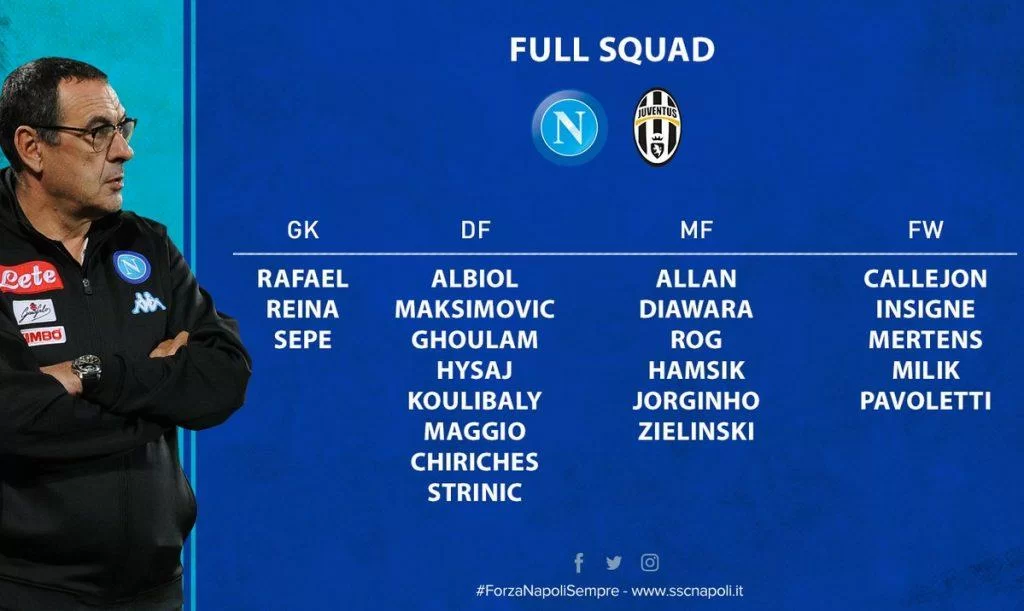 I convocati: Reina, Rafael, Sepe, Albiol, Chiriches, Ghoulam, Hysaj, Koulibaly, Maggio, Maksimovic, Strinic, Allan, Diawara, Hamsik, Jorginho, Rog, Zielinski, Callejon, Insigne, Mertens, Milik, Pavoletti.