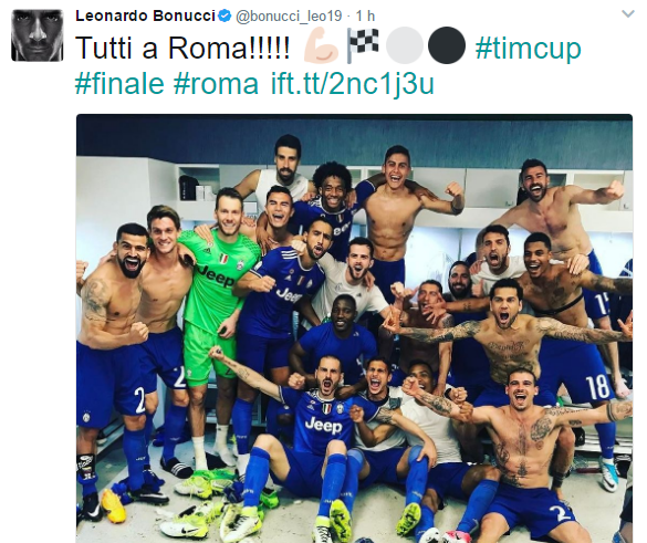 Leonardo Bonucci ha affidato ai social la sua reazione dopo la dolce sconfitta di Napoli, che ha garantito ai bianconeri l’accesso alla finale di Coppa Italia. “Tutti a Roma” ha scritto il difensore di Juventus e Nazionale su Twitter.