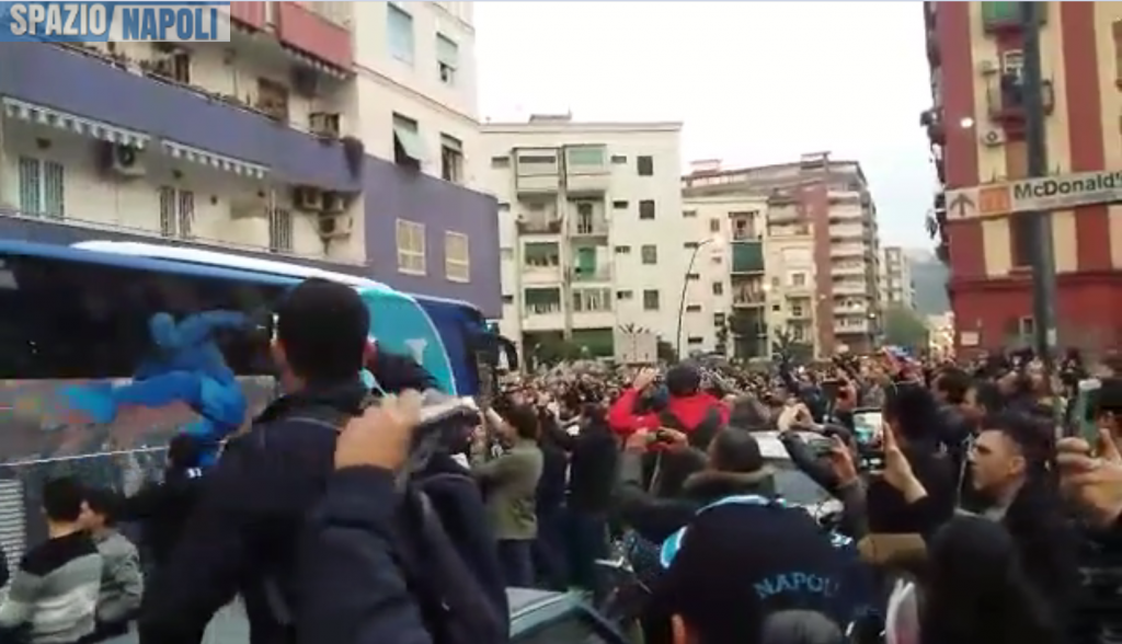 Ormai ci siamo, Napoli-Juve è ormai ad un passo. Dentro o fuori, in palio la finale di Coppa Italia contro la Lazio. Il pullman partenopeo è arrivato al San Paolo accolto dalla trepidante attesa del pubblico.