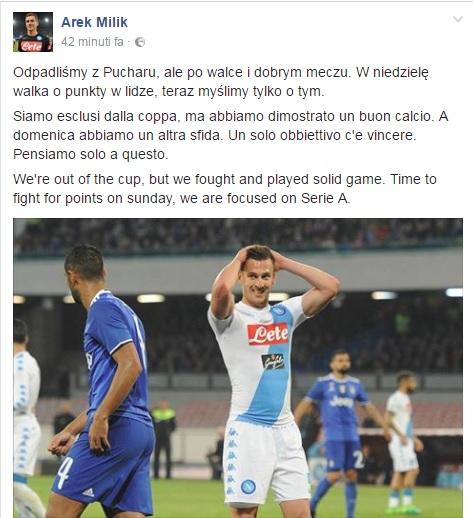 L’attaccante del Napoli, Arek Milik, ha espresso su Facebook la sua amarezza per l’eliminazione dalla Coppa Italia, tenendo a precisare che la squadra è già proiettata sulle prossime sfide.
