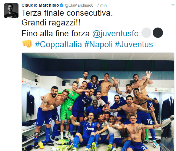 Claudio Marchisio ha commentato la partita tra Napoli e Juventus affidandosi al proprio profilo Twitter: “Terza finale consecutiva, grandi ragazzi! Fino alla fine forza Juventus” ha scritto il centrocampista bianconero sui social.