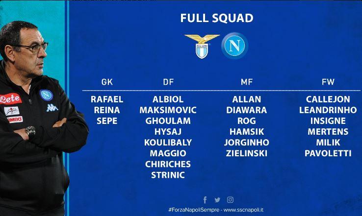 Il tecnico azzurro Maurizio Sarri ha diramato le convocazioni per la sfida contro la Lazio, in programma domenica sera alle ore 20.45.