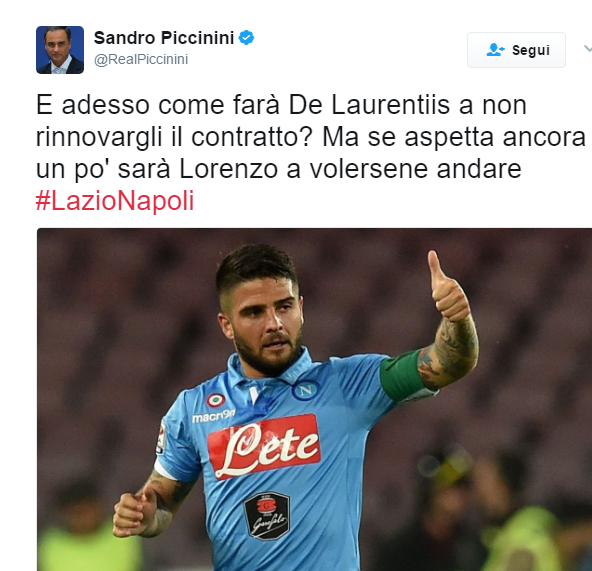 Tanti complimenti per il folletto napoletano. Tra i tanti, anche Sandro Piccinini, giornalista di Mediaset. Attraverso il proprio profilo Twitter, Piccinini elogia Insigne e lancia una frecciatina a De Laurentiis: “E adesso come farà De Laurentiis a non rinnovargli il contratto? Ma se aspetta ancora un po’ sarà Lorenzo a volersene andare”