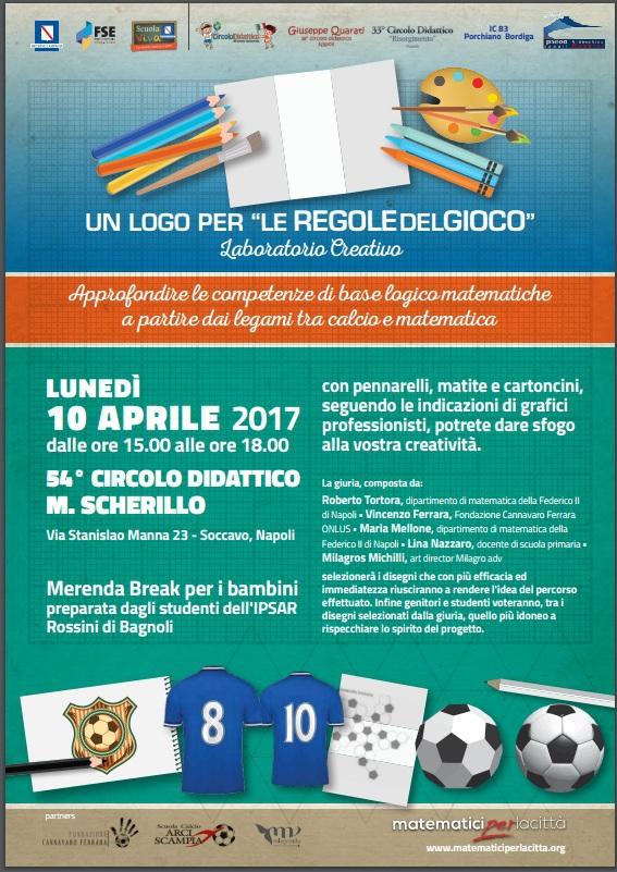 LUNEDÌ 10 APRILE 2017 PRESSO IL 54° CIRCOLO DIDATTICO M. SCHERILLO DALLE 15 ALLE 18 SI TERRÀ IL LABORATORIO PER LA CREAZIONE DEL ‘LOGO PER LE REGOLE DEL GIOCO’ CON LA PARTECIPAZIONE DI SCUOLE, BAMBINI, FAMIGLIE.