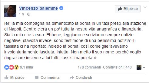 “Ieri la mia compagna ha dimenticato la borsa in un taxi preso alla stazione di Napoli. Dentro c’era un po’ tutta la nostra vita an