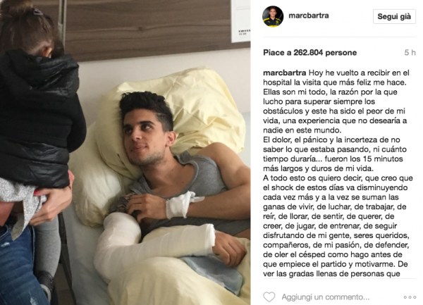 Marc Bartra, il difensore del Borussia Dortmund rimasto ferito martedì sera nelle esplosioni che hanno colpito il bus della squadra, ha lasciato un lungo messaggio sul suo profilo Instagram, corredato da una foto dove lo si vede con un vistoso gesso al braccio sinistro.