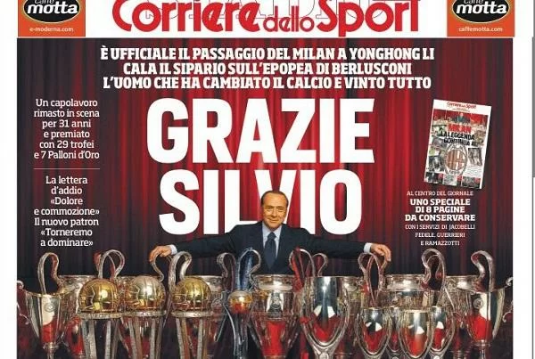La prima pagina del Corriere dello Sport apre con: “Grazie Silvio” in omaggio del a Silvio Berlusconi che lascia la presidenza del Milan dopo 31 anni.