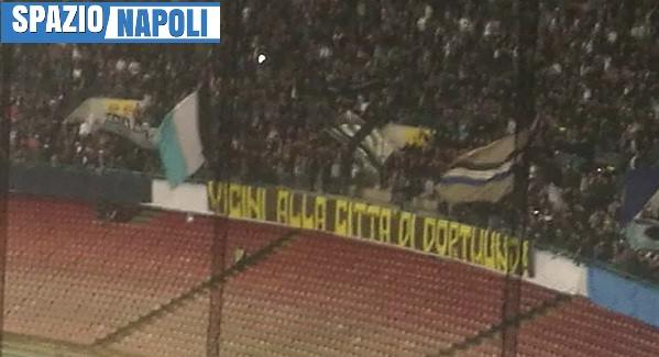Un gesto molto significativo è stato effettuato dalle due curve dell’impianto di Fuorigrotta, visto che sono stati esposti due striscioni: uno in ricordo del principe Totò, nel cinquantennale della sua scomparsa; l’altro a sostegno della città di Dortmund, colpita in settimana dal tentativo di attentato al bus della squadra a poche ore dalla sfida di Champions contro il Monaco.