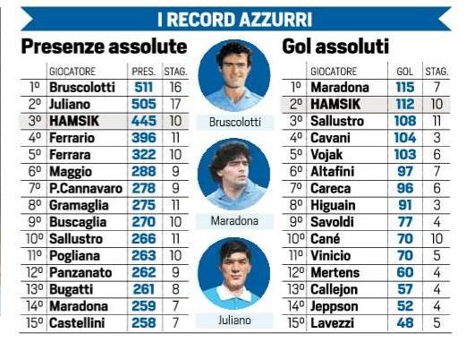 Ma lo slovacco è ben piazzato anche in un’altra classifica decisamente prestigiosa: Hamsik, infatti, è al terzo posto nel computo delle presenze assolute con la maglia del Napoli a quota 445, davanti a lui solo Juliano (505) e Bruscolotti 511.