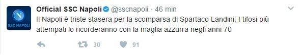 Dopo la notizia, giunta nel pomeriggio, della scomparsa di Spartaco Landini, è arrivato il tweet ufficiale della società partenopea. Messaggio di cordoglio del club di De Laurentiis per l’ex calciatore azzurro, andato via quest’oggi all’età di 73 anni.