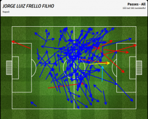 Il totale diceva 174 palloni toccati con il 93% – un’enormità – di precisione dei passaggi. Contro l’Udinese Jorginho si è superato, con 153 passaggi riusciti su un totale di 161 tentati.